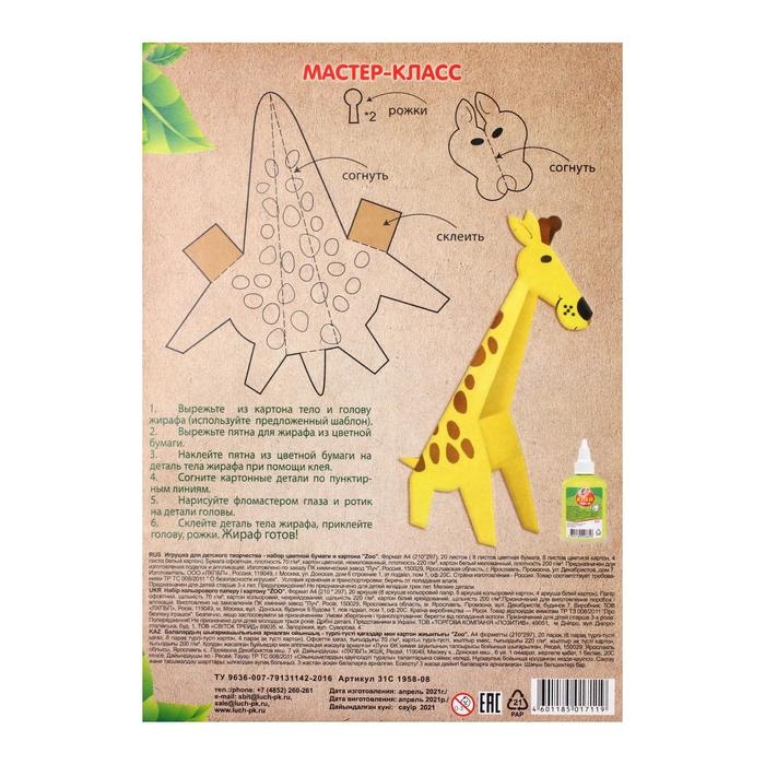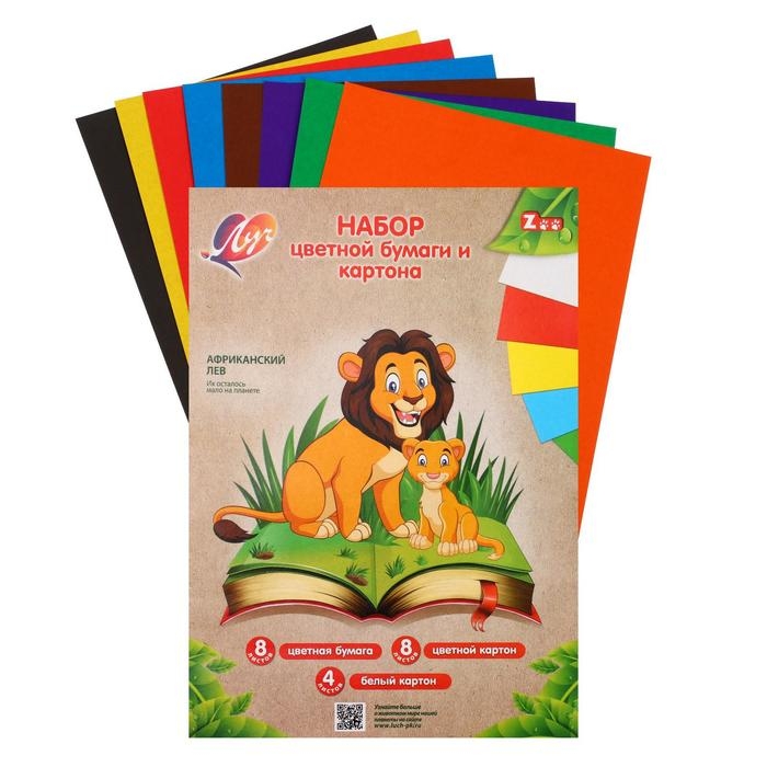 Набор для детского творчества А4, 8 листов цветная бумага + 8 листов цветной картон + 4 листа белый картон, "Zoo" Лев