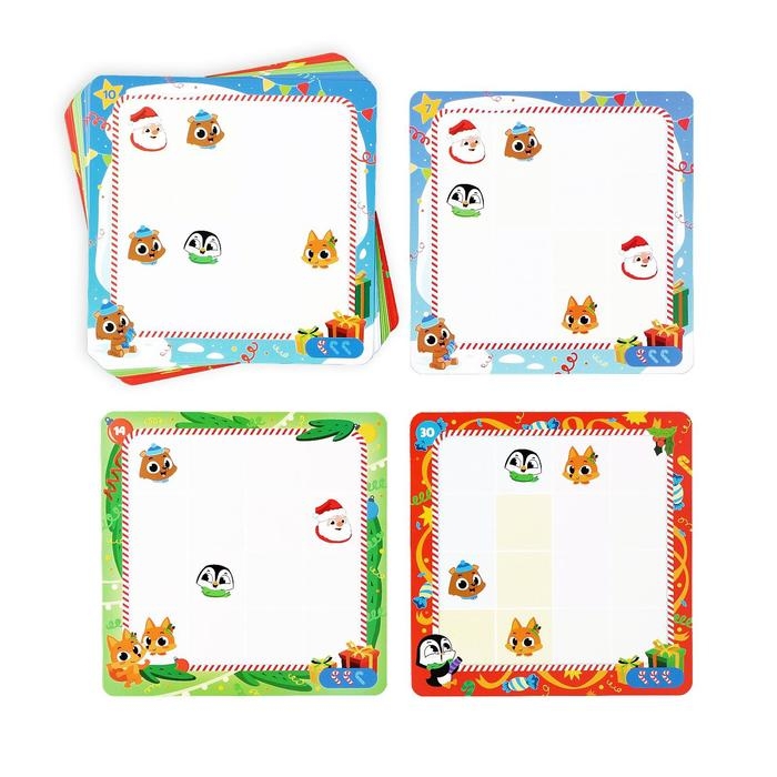 Это занимательная головоломка-судоку, которая поможет натренировать логику и смекалку маленьких участников. Главная задача — разместить жетоны с новогодними персонажами так, чтобы они не повторялись в одном ряду по горизонтали и вертикали.