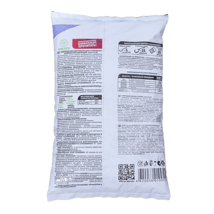 Способ применения: Основное внесение при перекопке почвы осенью или весной в открытом грунте 15-20 г/м2 на окультуренных почвах, 25-30 г/м2 - на неокультуренных почвах: В парниках и теплицах - 20-25 г/м2, при посадке плодово - ягодных и декоративных деревьев и кустарников - 80-200 г на посадочную яму. Местное внесение - при посеве 2-3 на метр рядка или 0,5-1,0 г в лунку при посадке картофеля и рассады с последующим перемешиванием с землёй. Овощные и цветочные 2-3 раза в период вегетации из расчета 20-30 г на 10 м2 в сухом виде водного раствора, растворив в 10 л.