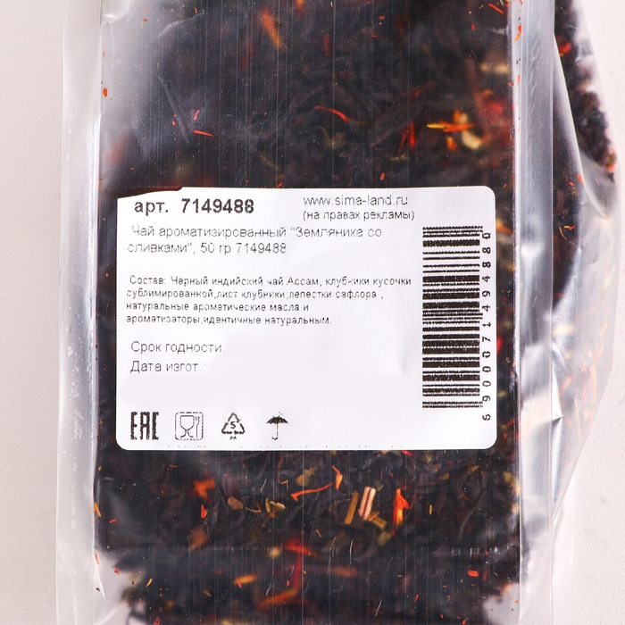 Черный индийский чай Ассам с ароматом ягод лесной земляники со сливками с добавлением рубленого листа земляники и кусочков ягод клубники. Украшен лепестками изысканного сафлора.