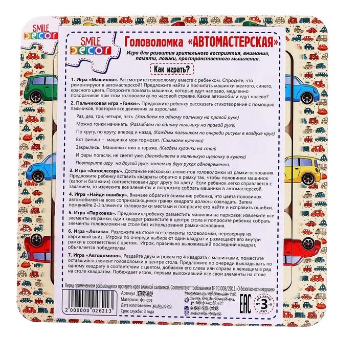 Головоломка «Автомастерская» — это увлекательная игра, которая не только развлечет вашего ребёнка, но и способствует его развитию, включая зрительное восприятие, внимание, память, логику и пространственное мышление.