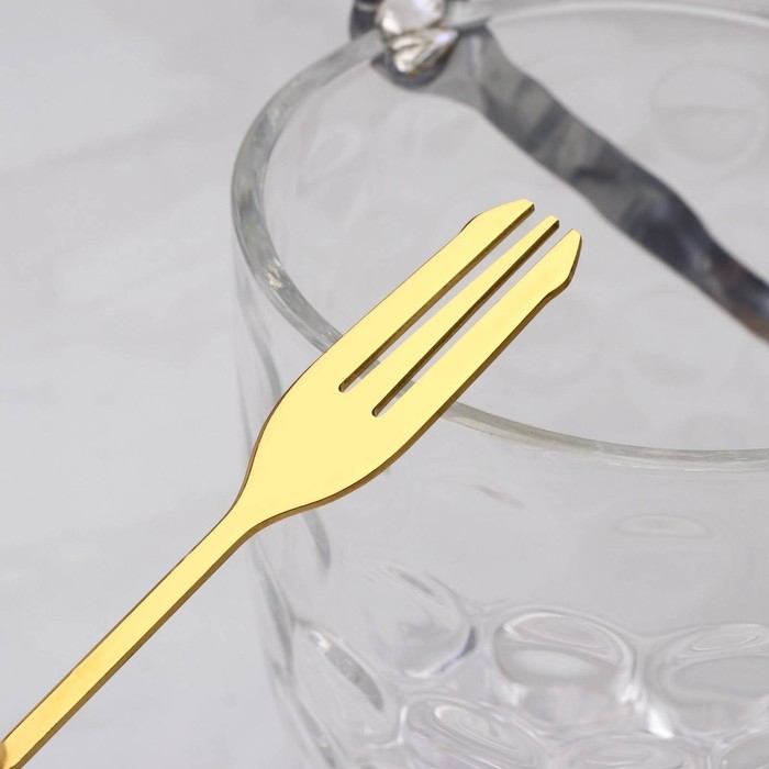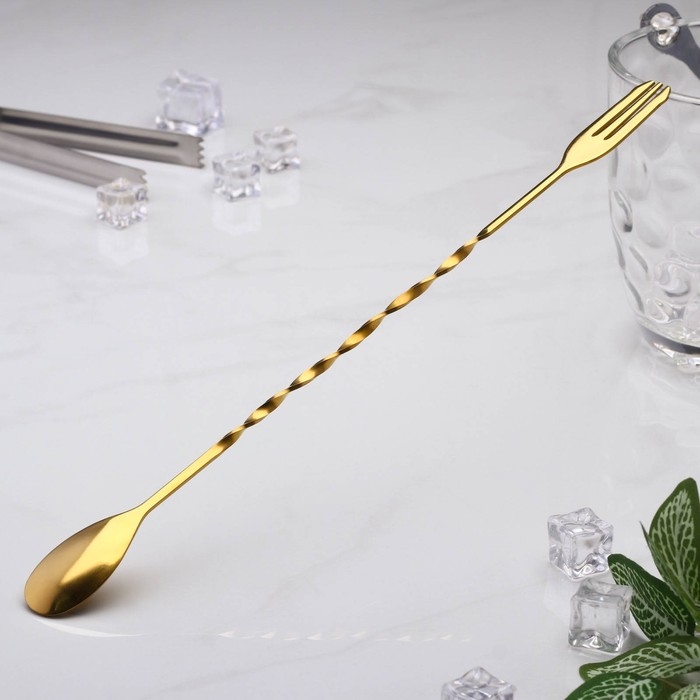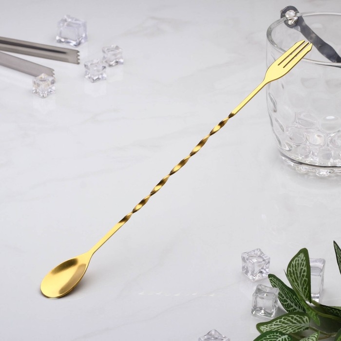 Ложка барная из нержавеющей стали с вилкой, длина 32,5 см, цвет золотой
