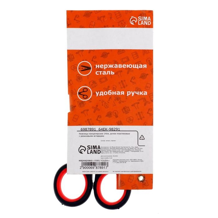Ножницы канцелярские 14 см, ручки пластиковые с резиновыми вставками