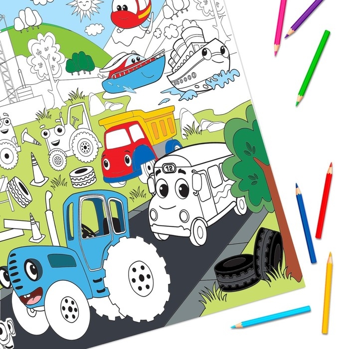 Раскраска-гигант «Весёлый транспорт», 84 × 59 см, Синий трактор