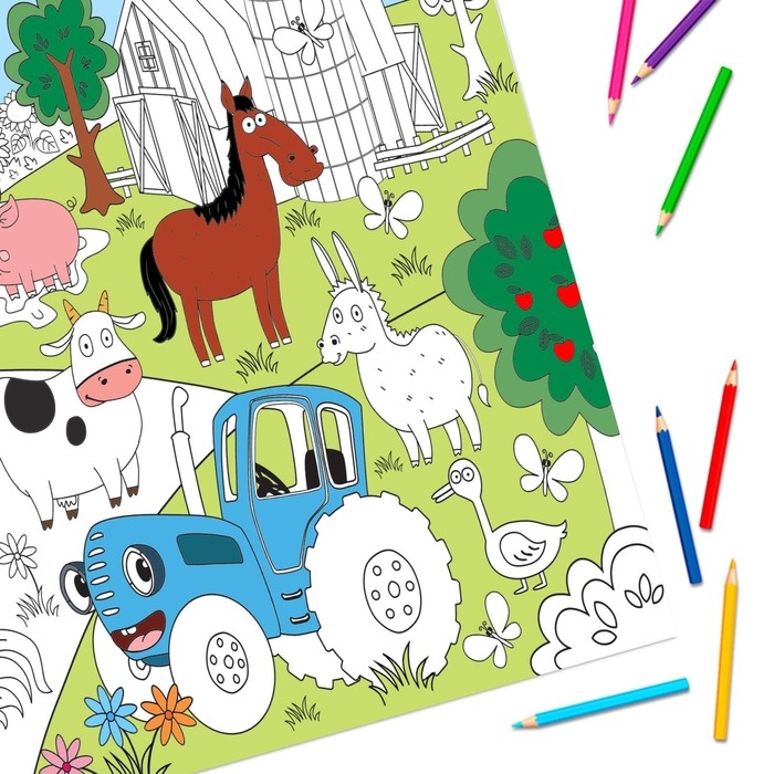 Раскраска-гигант «Весёлая ферма», 84 × 59 см, Синий трактор