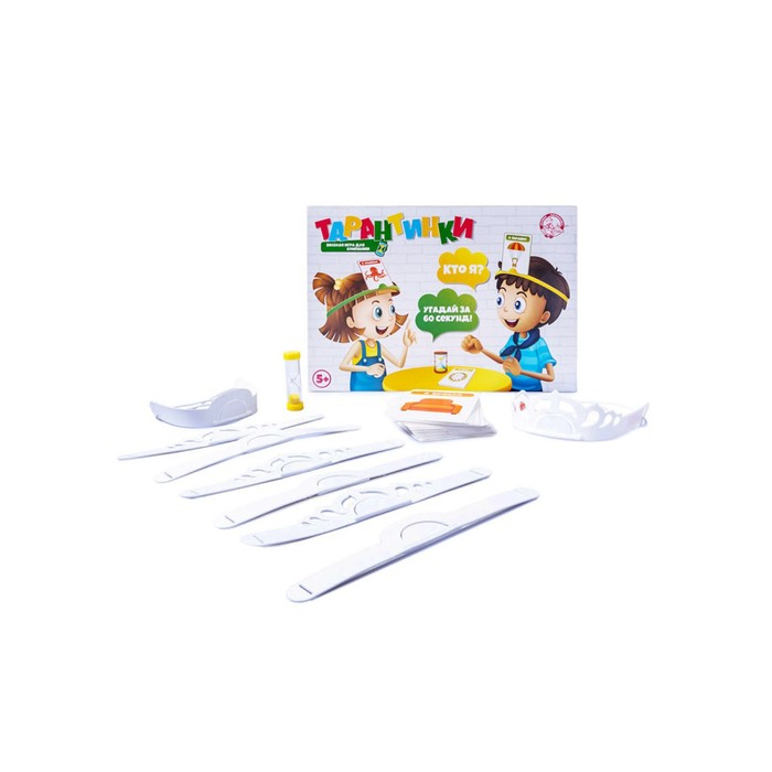 Правила игры: 1. Перемешайте карточки и выложите на стол рисунками вниз. Вытяните случайную карту и поместите на диадемку-держатель. 2. Переверните песочные часы и начните задавать вопросы, на которые можно ответить «да» или «нет». 3. Если справились за минуту – возьмите новую карточку. Ход переходит к следующему участнику. 4. Игра идет, пока не закончатся все карточки. Победителем признается участник, собравший больше всех карточек.