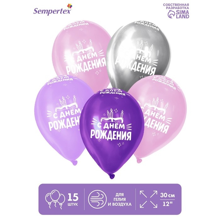 Воздушный шар латексный 12" "С Днем Рождения.", пастель, 15 шт.