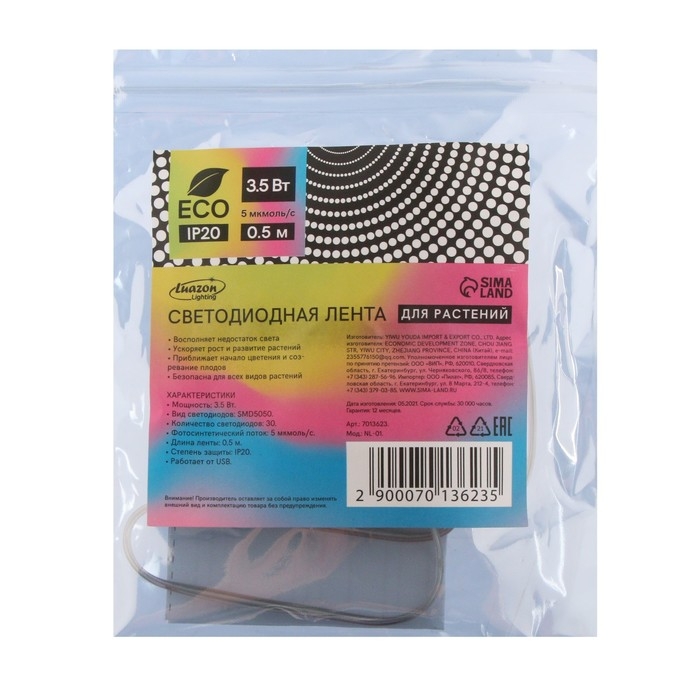 Фитолента светодиодная Luazon, 5 В, SMD5050, 0.5 м, IP20, 3.5 Вт, 60LED/м, USB, мультиспектр