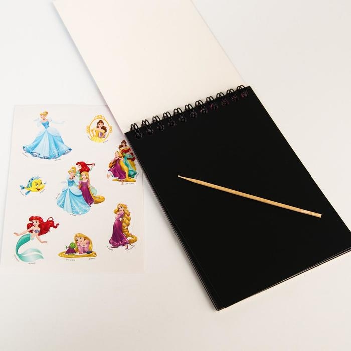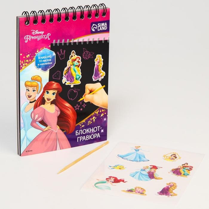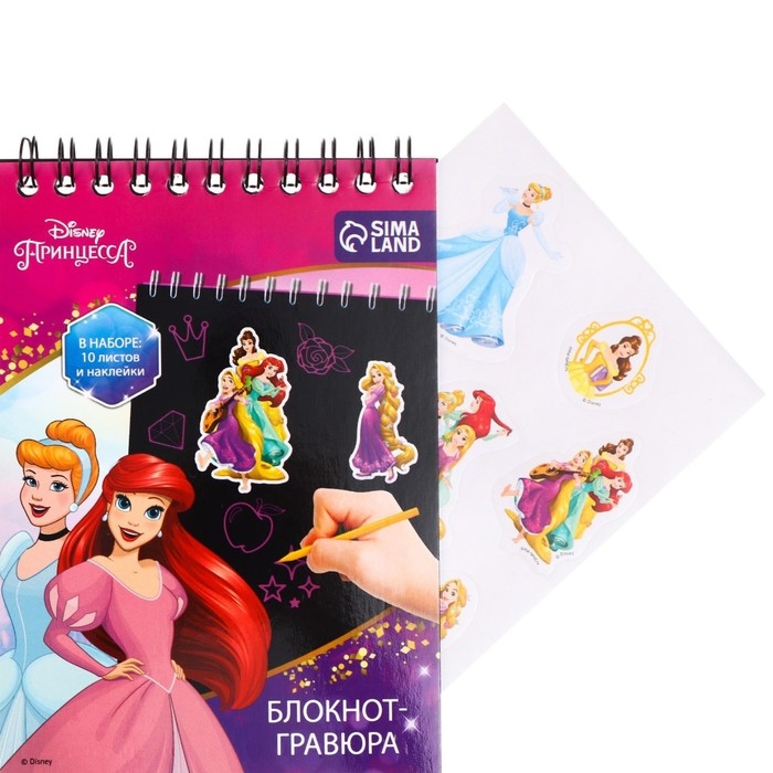 Гравюра-блокнот со штихелем, 10 листов, наклейки, Принцессы