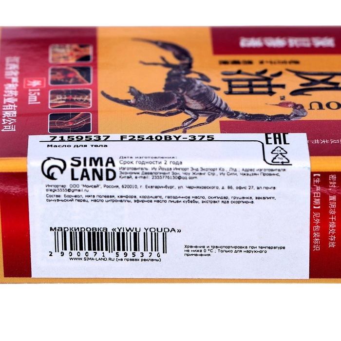 Состав: борнеол, мята полевая, камфора, кордицепс, гвоздичное масло, скипидар, грушанка, эвкалипт, сычуаньский перец, масло цитронеллы, эфирное масло лицеи кубебы, экстракт яда скорпиона.