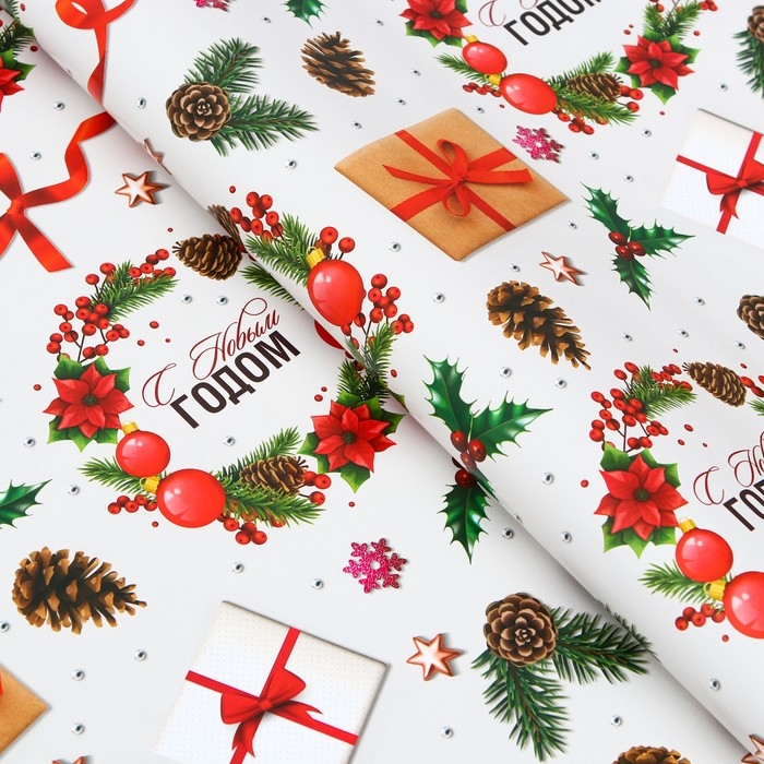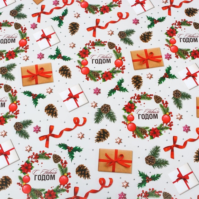 Новый год. Бумага упаковочная глянцевая "Рождественские подарки",70 х 100 см,1 лист