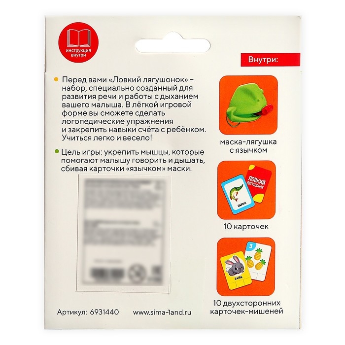 В комплекте: маска-лягушка с язычком, 10 карточек, 10 двусторонних карточек-мишеней.