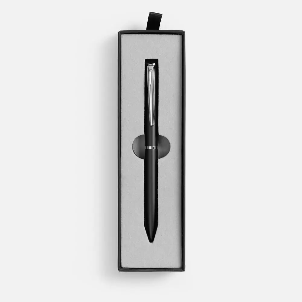 Картонный футляр с покрытием софт-тач с флокированным ложементом для одной ручки.