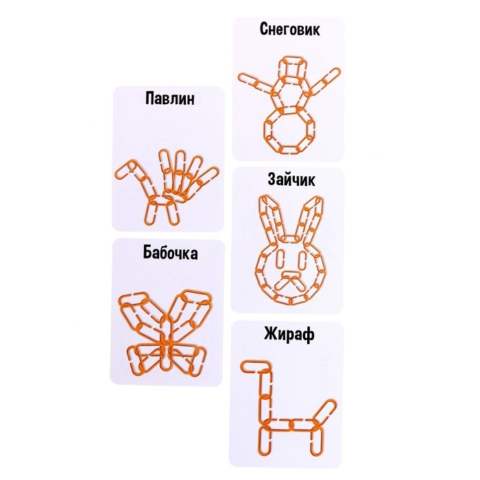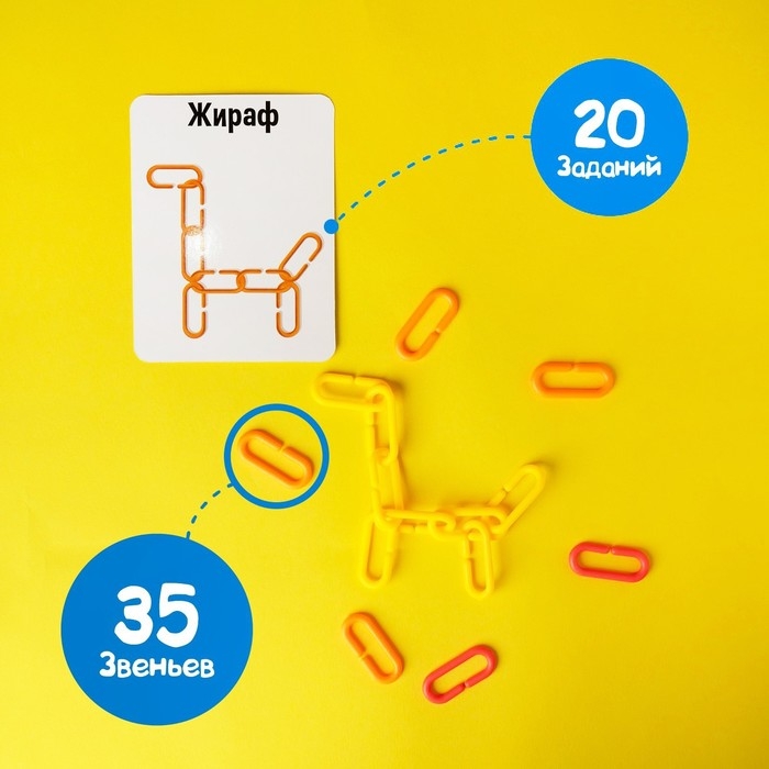 - Достаньте из коробочки всё содержимое: 35 звеньев, 20 двусторонних карточек заданиями.