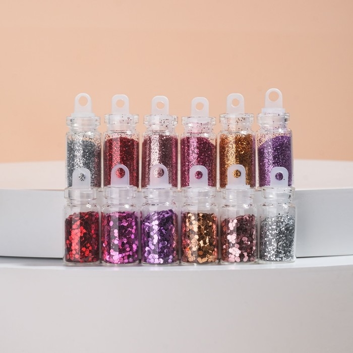 Блёстки для декора ногтей «Нежность», мелкие/средние/крупные, 12 бутылочек