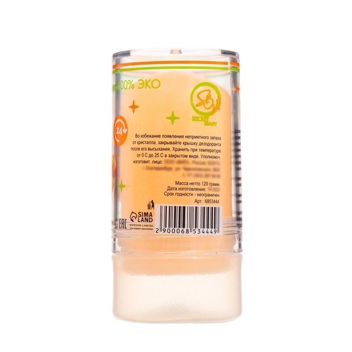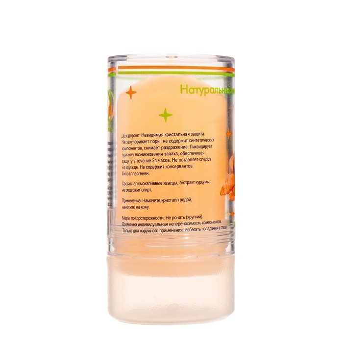 Минеральный дезодорант «Куркума». Представляет собой натуральный кристалл алунит, обладающий высокой антибактериальной активностью. Предотвращает появление пота и неприятного запаха в течение всего дня. Заживляет ранки и увлажняет.