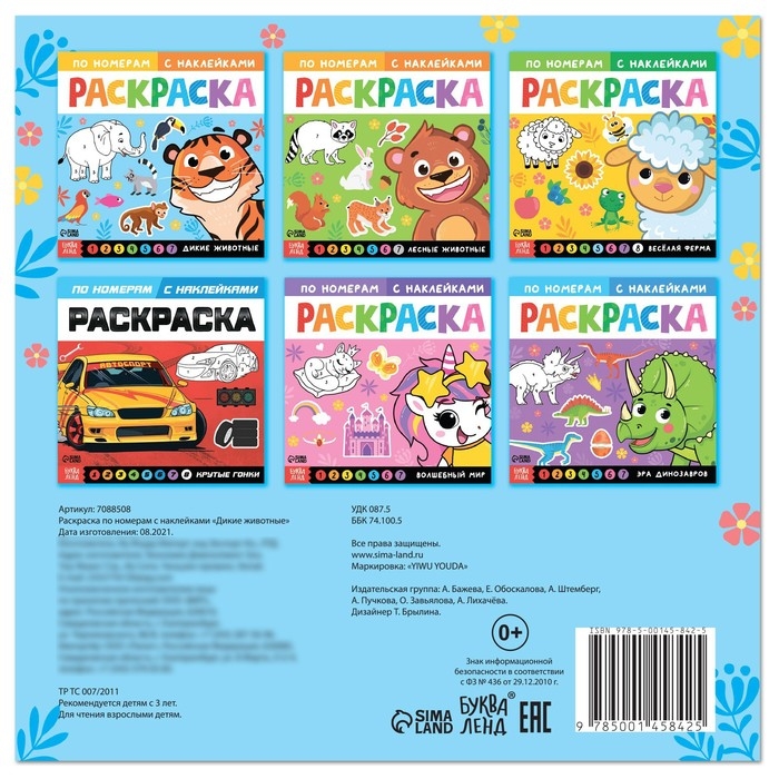 Раскраска по номерам с наклейками — это творческая книга с контурными картинками животных. Ребёнок сможет их раскрасить карандашами, красками или фломастерами. Страницы, обложка и наклейки выполнены из бумаги.