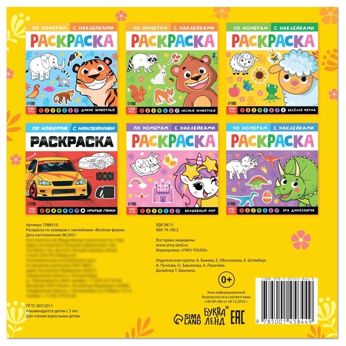 Раскраска по номерам с наклейками — это творческая книга с контурными картинками животных. Ребёнок сможет их раскрасить карандашами, красками или фломастерами. Страницы, обложка и наклейки выполнены из бумаги.