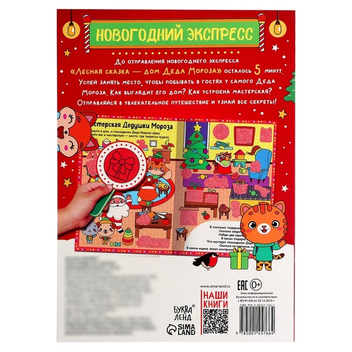 Наводите её на разные фрагменты картинок, отмеченные специальной краской, и узнайте, как выглядит дом и мастерская новогоднего волшебника. Внутри книги вас ждут увлекательные задания, красочные картинки и милые сказочные персонажи.