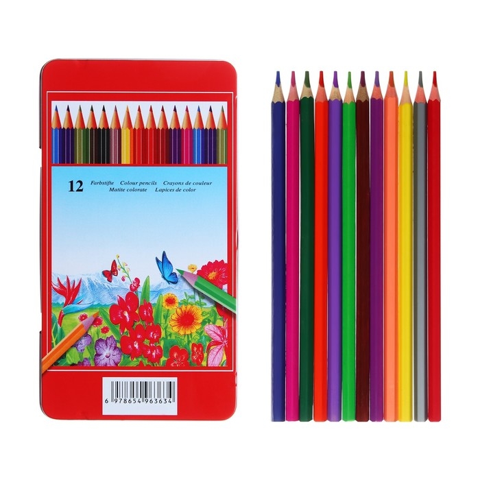 Карандаши акварельные 12 цветов, корпус деревянный, шестигранные, в металлической коробке