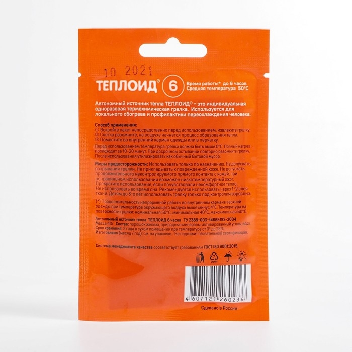 Автономный источник тепла "Теплоид" - это одноразовая грелка, которая не нуждается в электричестве или топливе, генерируя тепло автономно. Обычно его размещают во внутренних карманах одежды, в рукавицах, обуви.