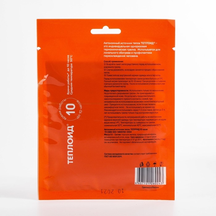 Автономный источник тепла "Теплоид" - это одноразовая грелка, которая не нуждается в электричестве или топливе, генерируя тепло автономно. Обычно его размещают во внутренних карманах одежды, в рукавицах, обуви.