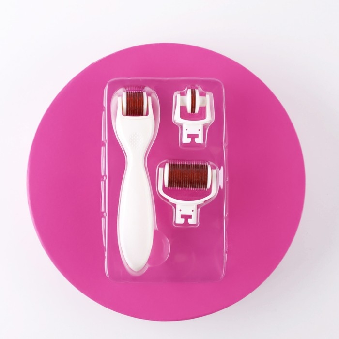Мезороллер со сменными насадками для лица, головы и тела представляет собой валик с тончайшими иглами из стали.