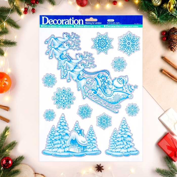 Наклейки на окна "Новогодние" снежинки, олени, дед мороз, 41 х 29 см