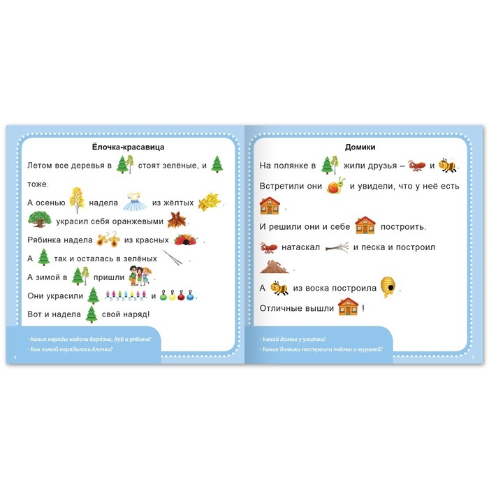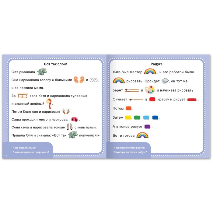 Книга поможет привить малышу любовь к чтению, а также потренировать грамотную речь. Особенность издания в том, что некоторые слова в тексте заменены картинками. Задача малыша — отгадать, что изображено, и поставить слово в правильные падеж и число.