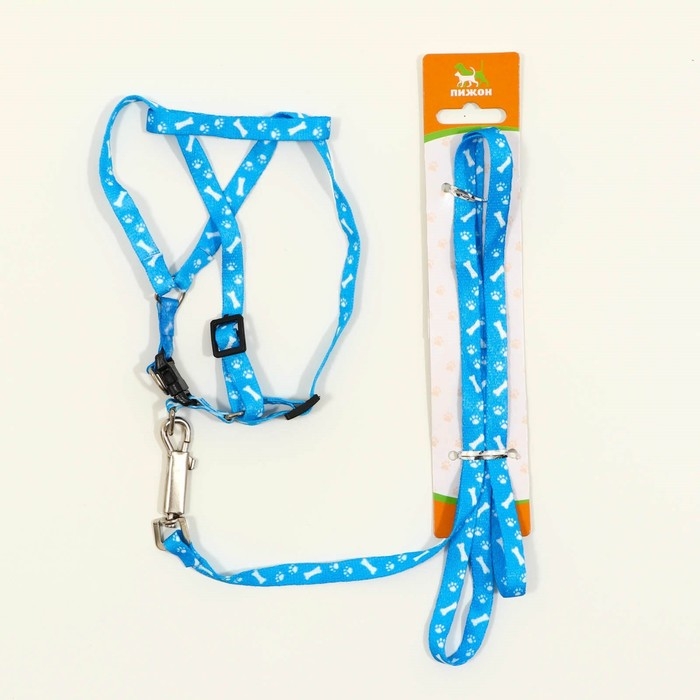 Комплект прогулочный включает в себя яркие шлейку и поводок, изготовленные из качественного капрона с использованием металлической и пластиковой фурнитуры.
