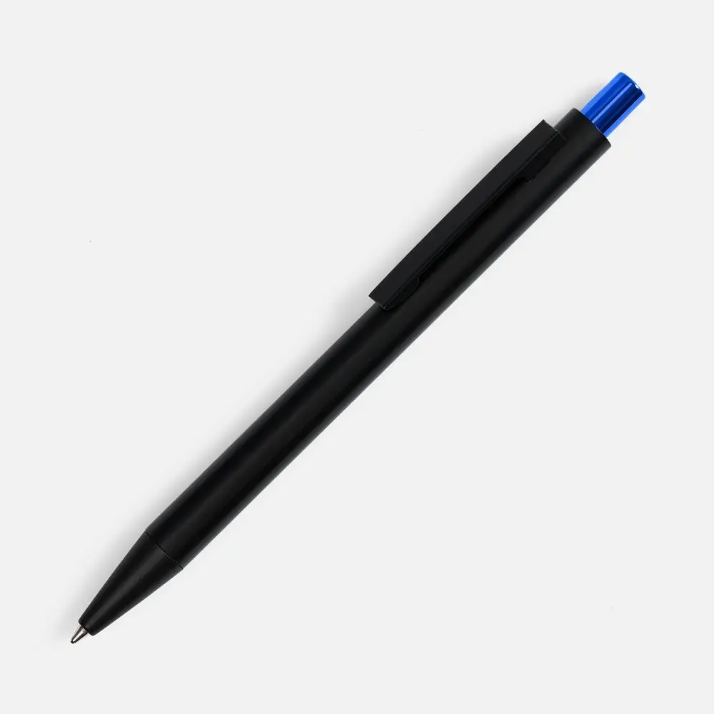 Ручка строгих форм в черном матовом корпусе с цветными деталями, которая точно может удивить, — гравировка на ней вскрывается цветом в тон кнопке.