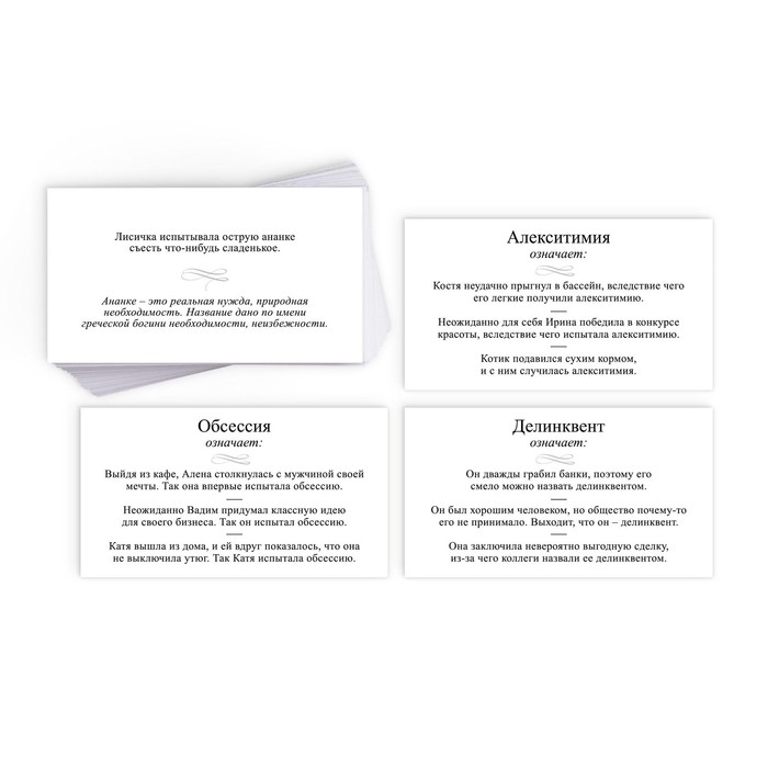 На каждой карточке написано странное слово, связанное с психологией, а также три примера его использования. Задача игрока — выбрать правильный вариант. Чтобы проверить себя или другого участника, просто переверните карточку.
