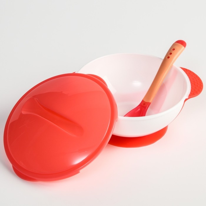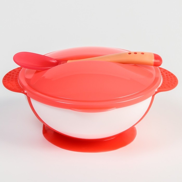 Набор детской посуды: миска на присоске 340мл., с крышкой, термоложка, цвет розовый