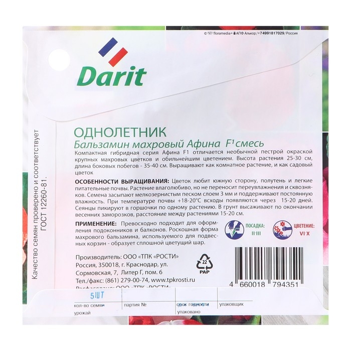 Семена цветов бальзамин Махровый "Афина", смесь, О, 5 шт