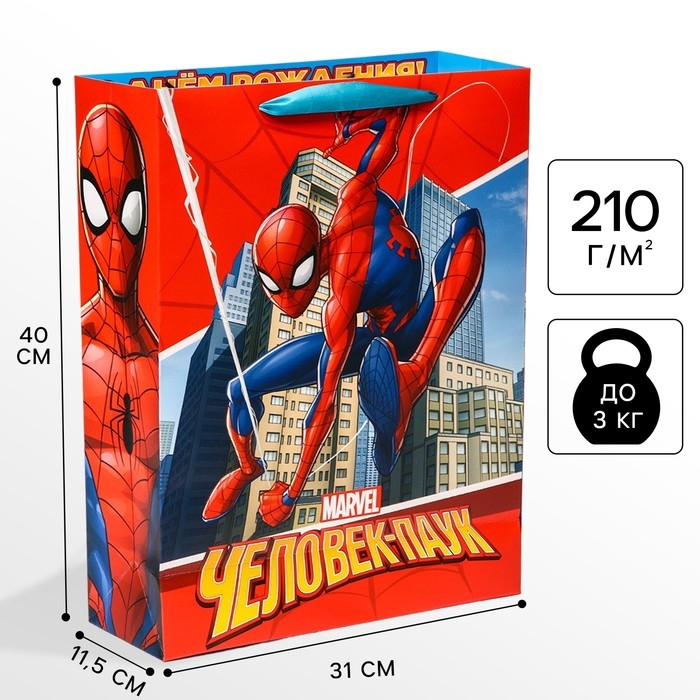 Пакет подарочный "С Днем рождения" 31х40х11.5 см, упаковка, Человек-паук