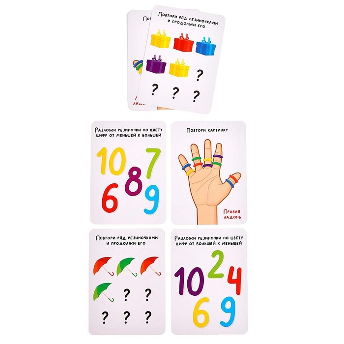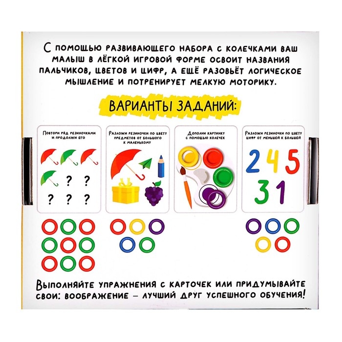 В комплекте 20 заданий, 20 ярких цветных колечек и инструкция к игре.
