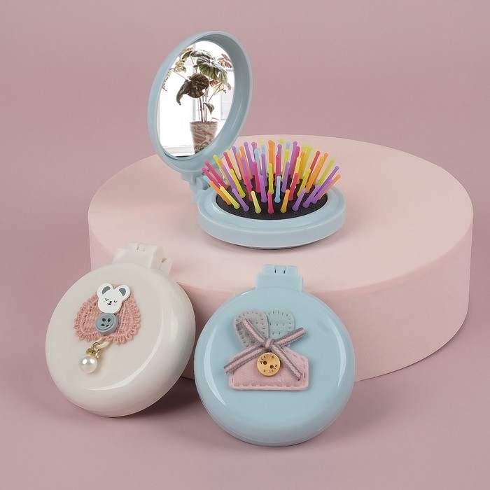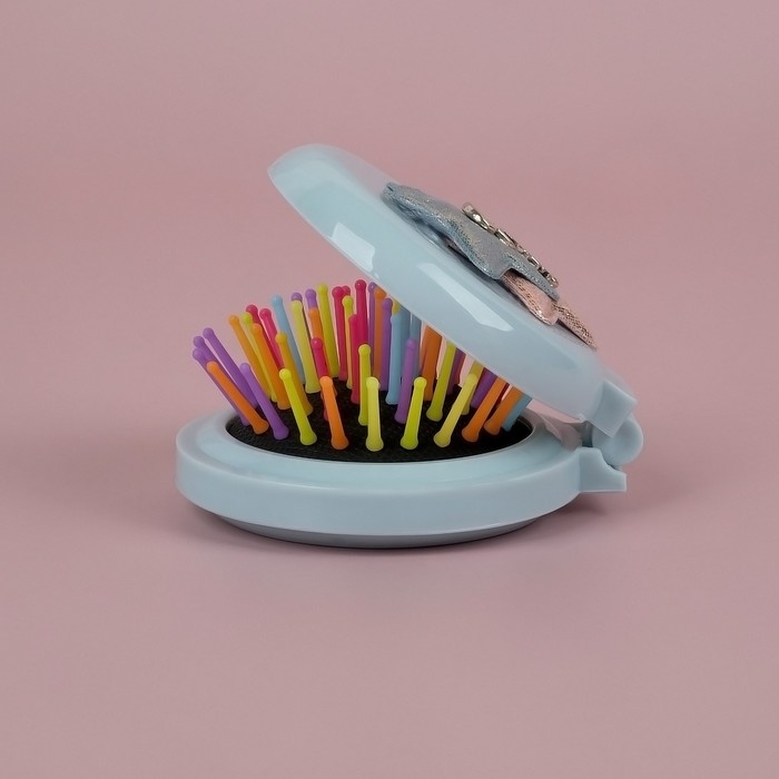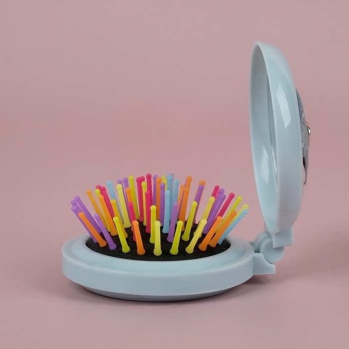 Расчёска массажная «Мягкие зверята», складная, с зеркалом, d = 7,5 см, рисунок МИКС