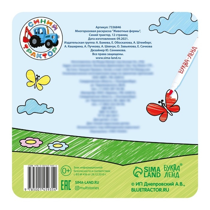 Многоразовая раскраска «Животные фермы», 12 стр., 16 × 16 см, Синий трактор