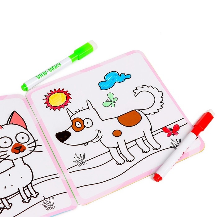 Многоразовая раскраска — настоящая находка для маленьких любителей раскрашивать! К раскраскам прилагается 5 цветных маркеров, которые легко удаляются со страниц при необходимости. Поэтому ребёнок сможет раскрашивать картинки с любимыми героями неограниченное количество раз. Ведь всё можно стереть специальной губкой на колпачке маркера и начать раскрашивать сначала!