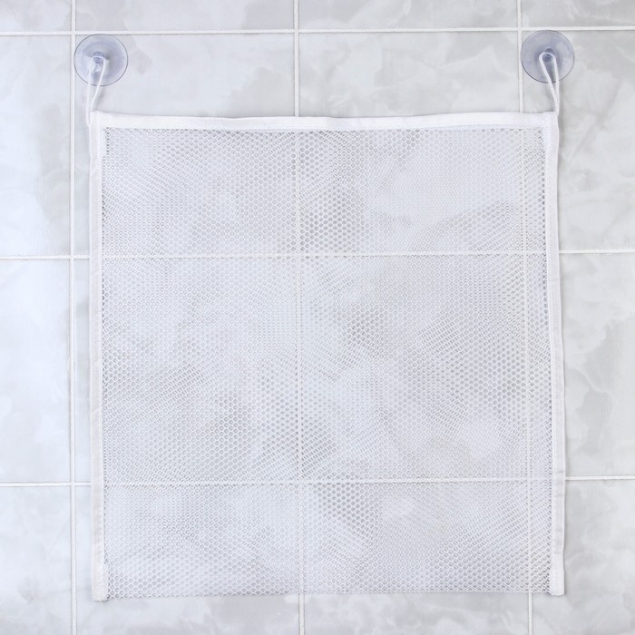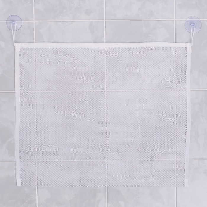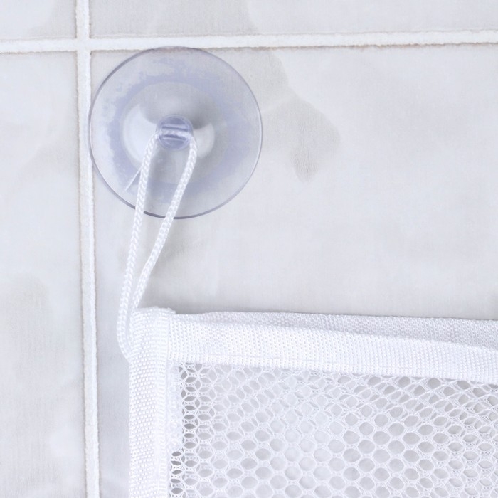 Сетка для игрушек поможет хранить детские принадлежности и игрушки в чистоте и свободном доступе. Изделие выполнено из прочного материала и крепится к стене с помощью двух присосок.