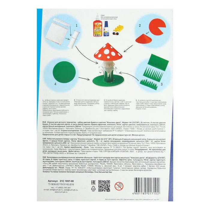 Набор для детского творчества А4, 8 листов цветная бумага + 8 листов цветной картон + 4 листа белый картон, "Луч" Классика цвета