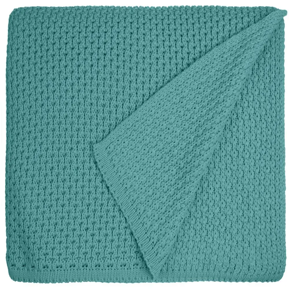 Модель: однотонный плед с фактурной вязкой, которая позволяет сделать его воздушным и объемным. Чередуя различные типы петель на гладком полотне, можно вывязать любую графику — логотип, текст, товарный знак.