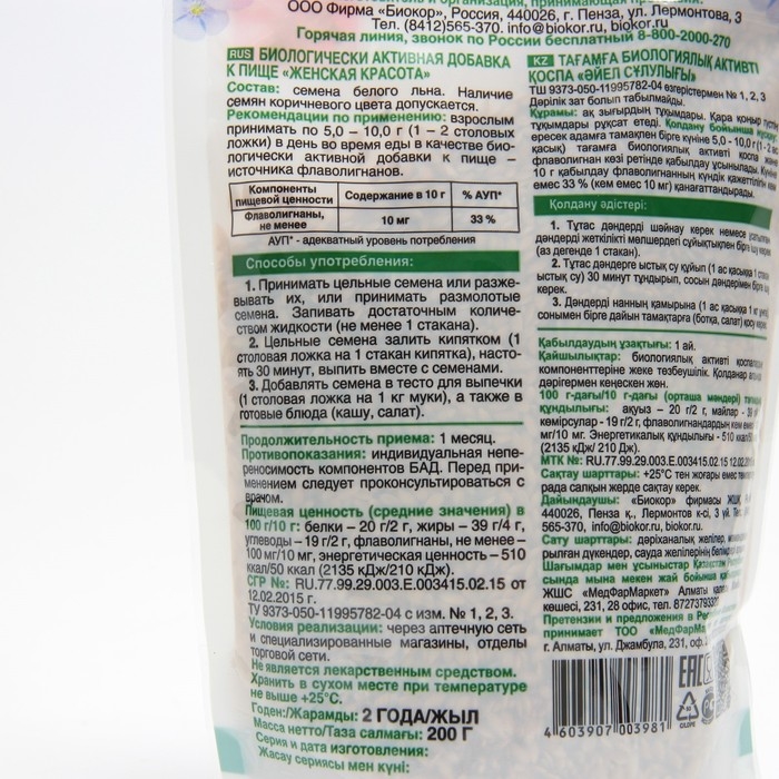 Семена белого льна «Биокор «Женская красота» – семена белого льна, натуральный продукт, благоприятно влияющий на женское здоровье (способствует нормализации гормонального баланса, улучшению работы желудочно-кишечного тракта).