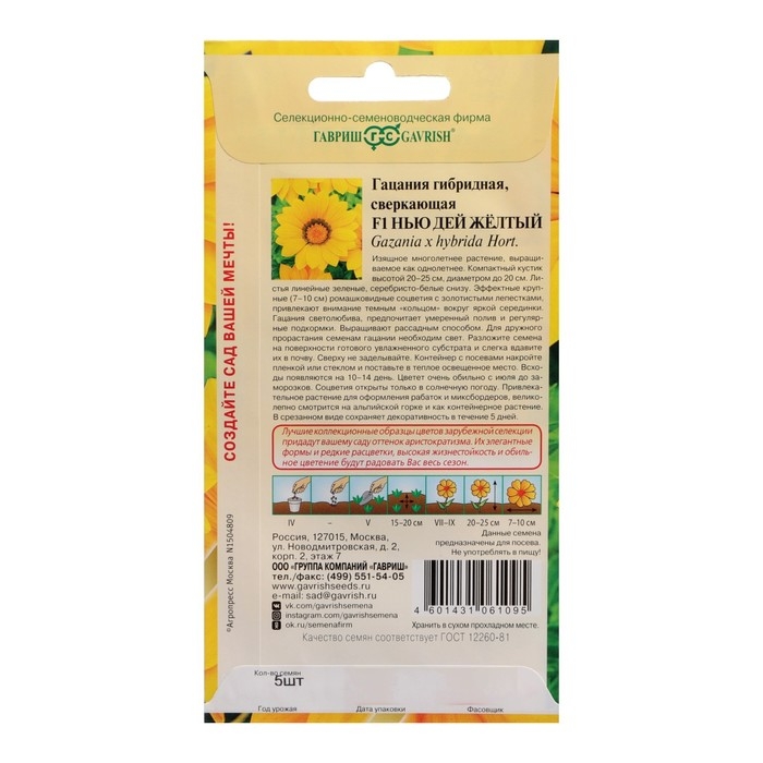 Семена цветов Гацания "Нью Дей Желтый F1", 4 шт
