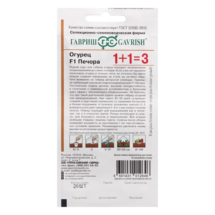 Семена Огурец корнишон "Печора F1", серия 1+1, 20 шт