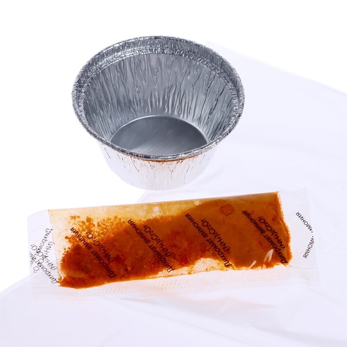 - Содержимое пакетика высыпьте горкой в алюминиевую чашу. А её поставьте на любую негорючую поверхность, например на что-то керамическое или на кафельную плитку.