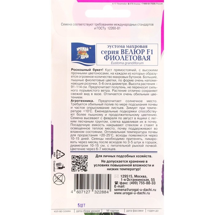 Семена цветов Эустома махровая "Велюр", фиолетовая, F1, в ампуле, 0,005 г.