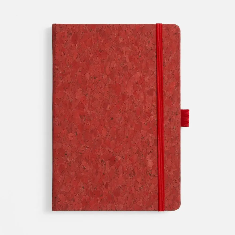 Блокнот с твердой обложкой из из натуральной окрашенной пробки, дополнен петлей-резинкой для ручки, ляссе и резинкой в цвет обложки.