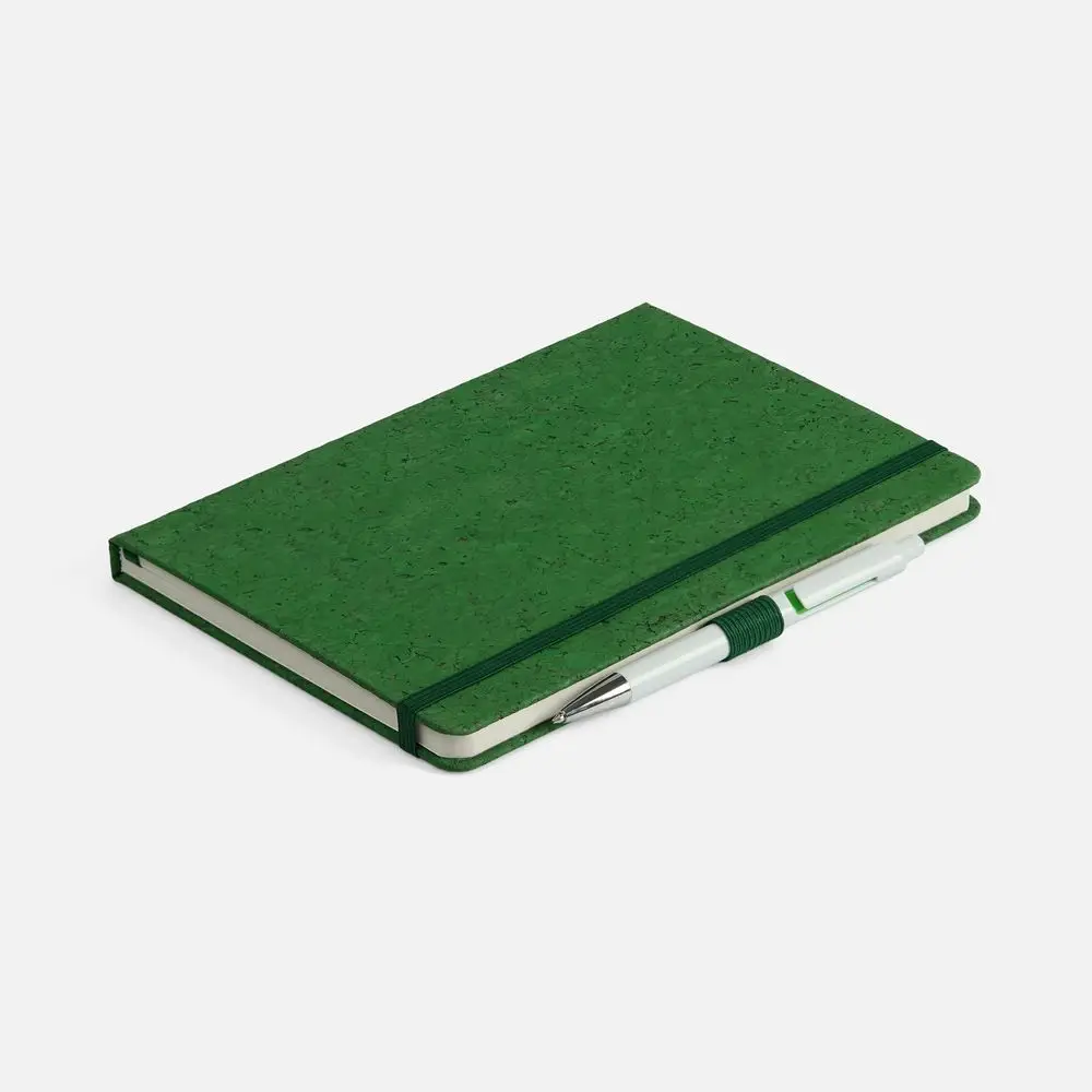 Блокнот с твердой обложкой из из натуральной окрашенной пробки, дополнен петлей-резинкой для ручки, ляссе и резинкой в цвет обложки.