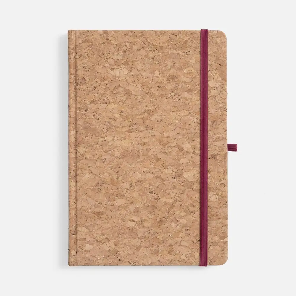 Блокнот в твердой обложке из натуральной неокрашенной пробки, дополнен цветными петлей-резинкой для ручки, ляссе и резинкой на обложку.